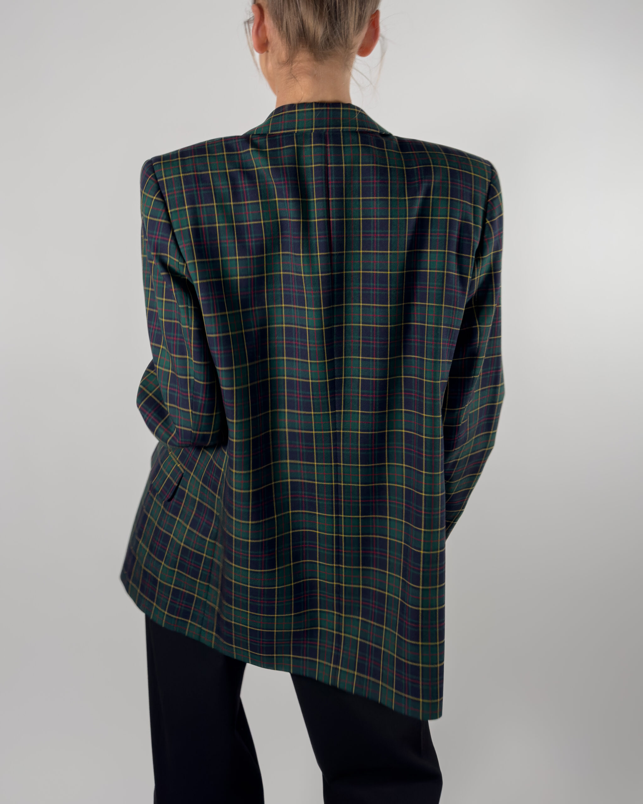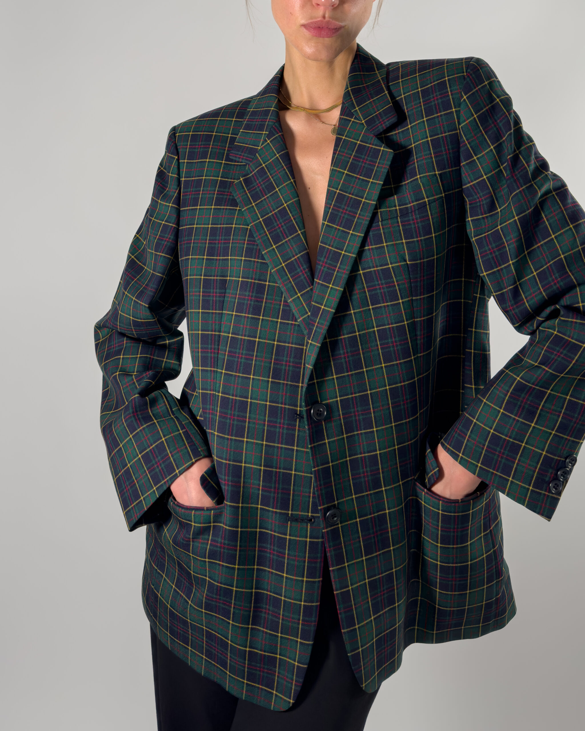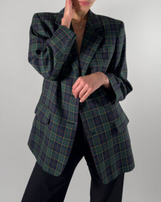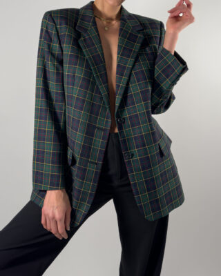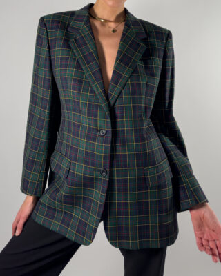 Classic checkered wool blazer from DAKS London, timeless design in dark blue and green. Made in Great Britain.