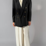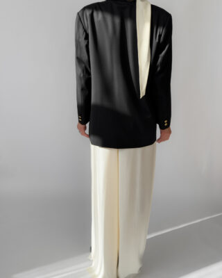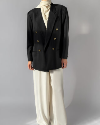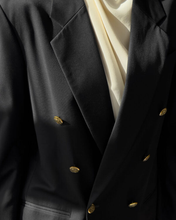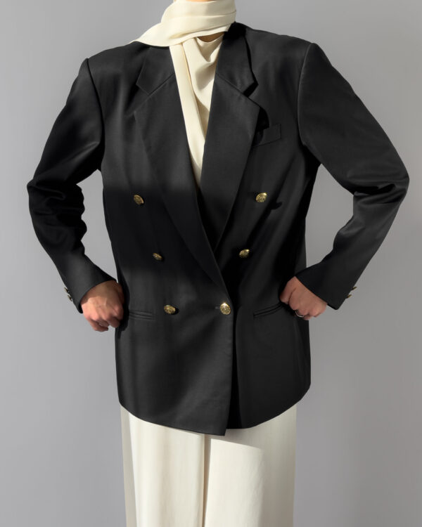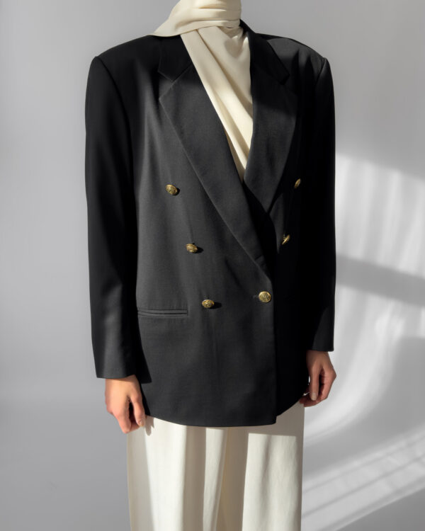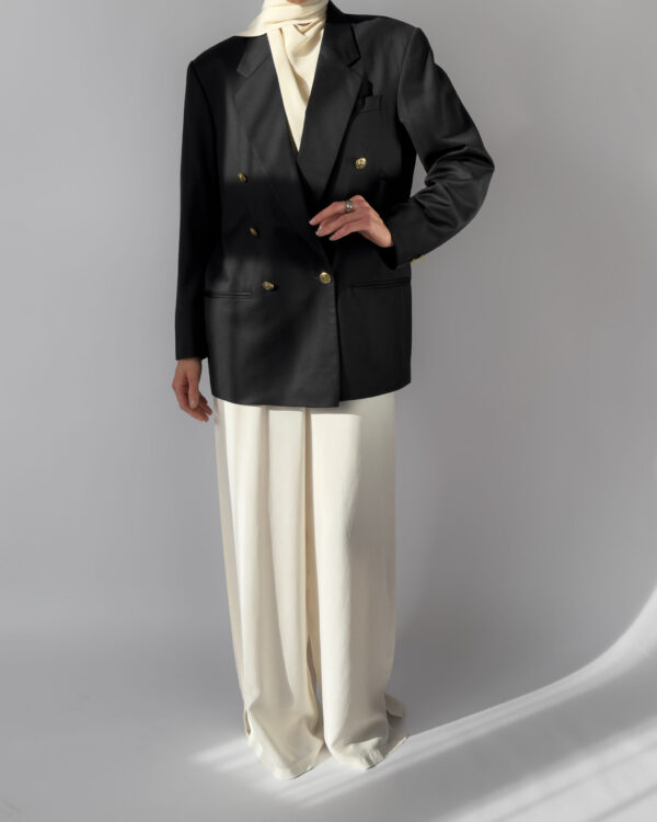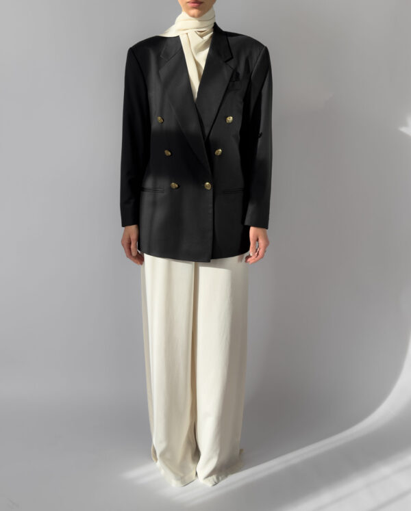 Silky black lining and structured shoulder pads. High-quality wool with viscose lining (no material label).
