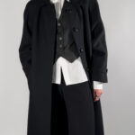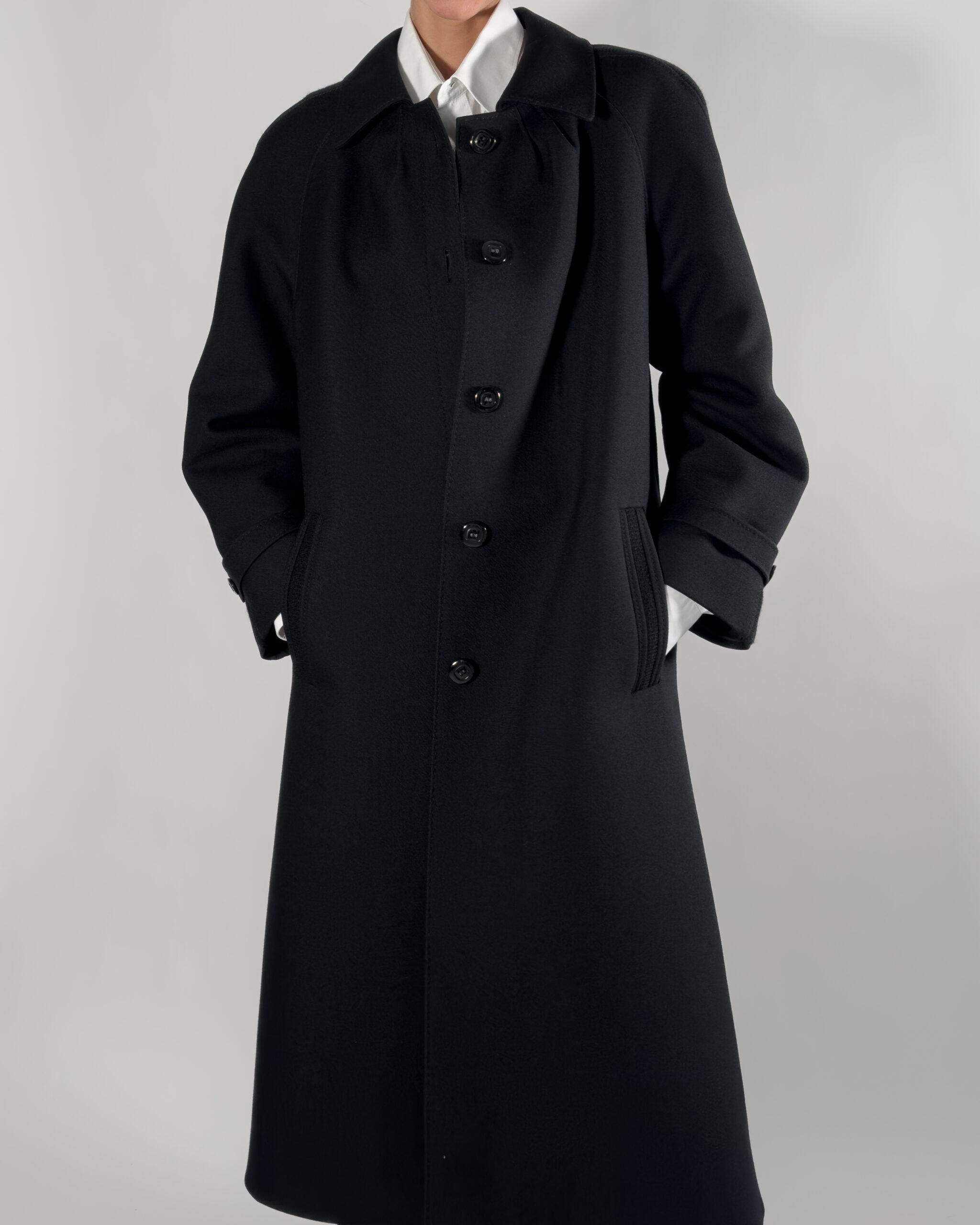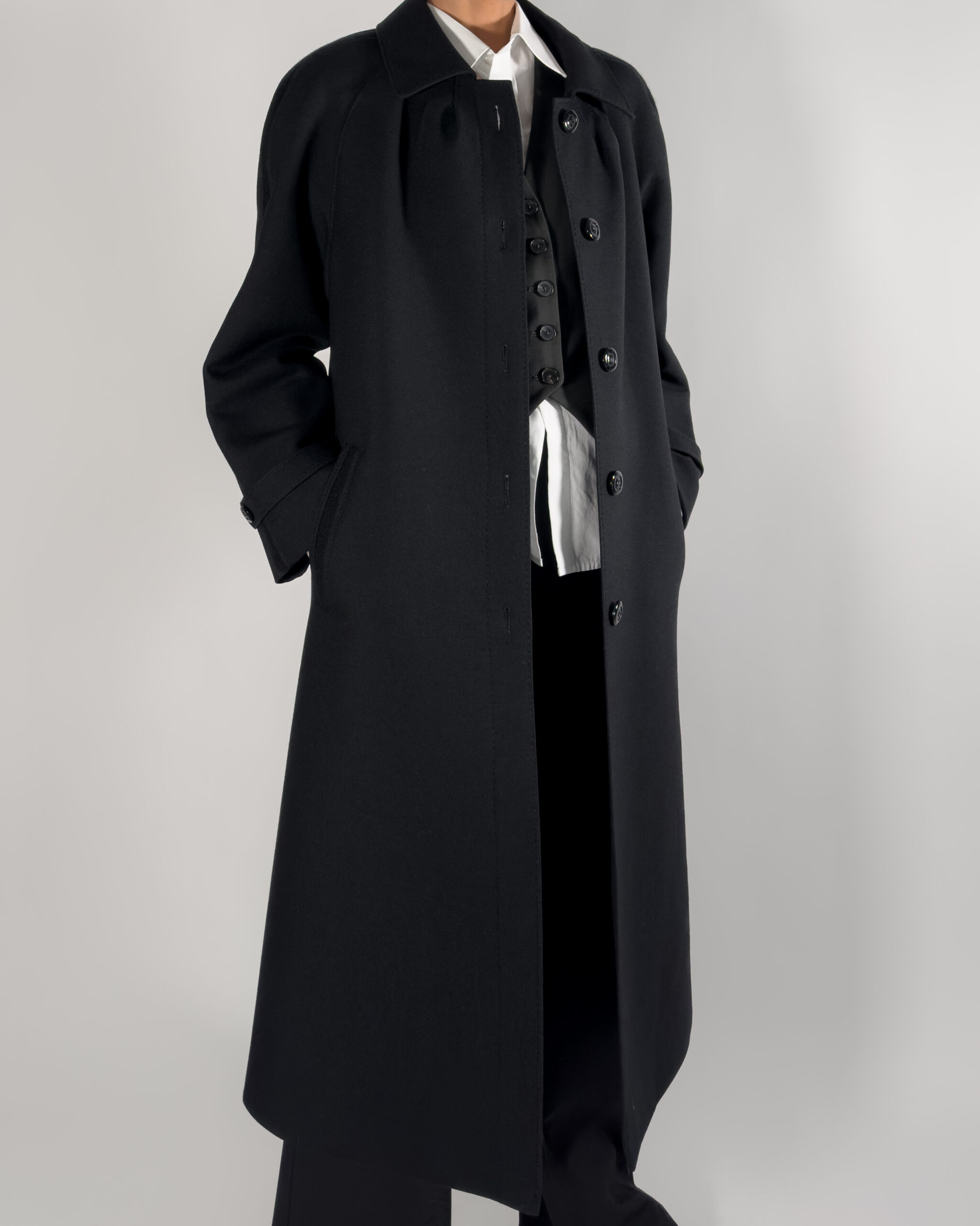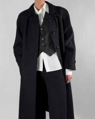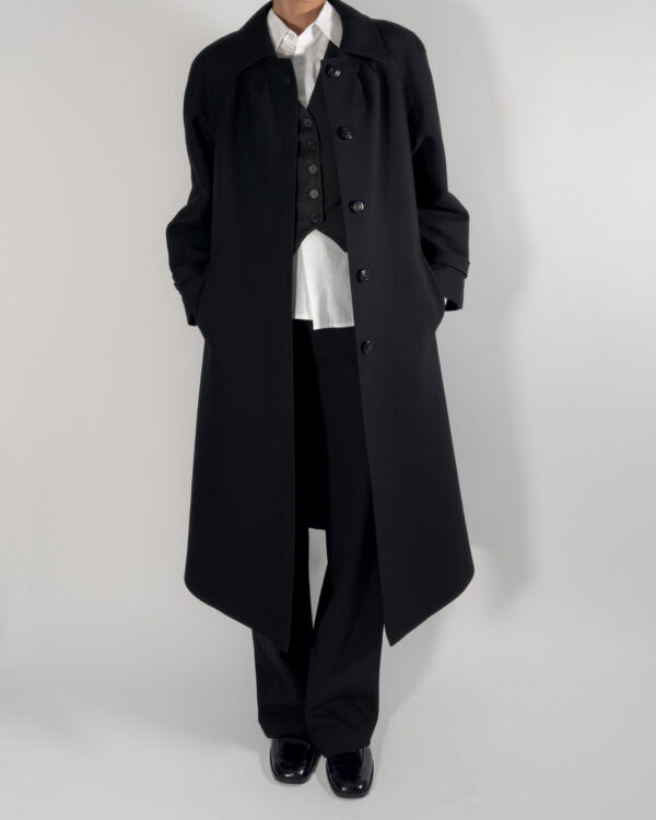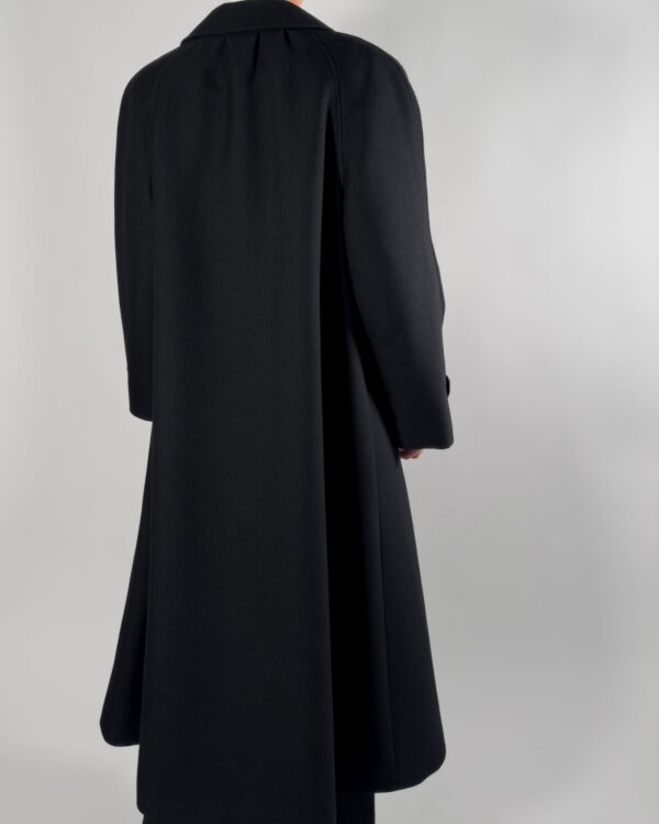 Virgin wool long coat in a sophisticated black with viscose lining.
