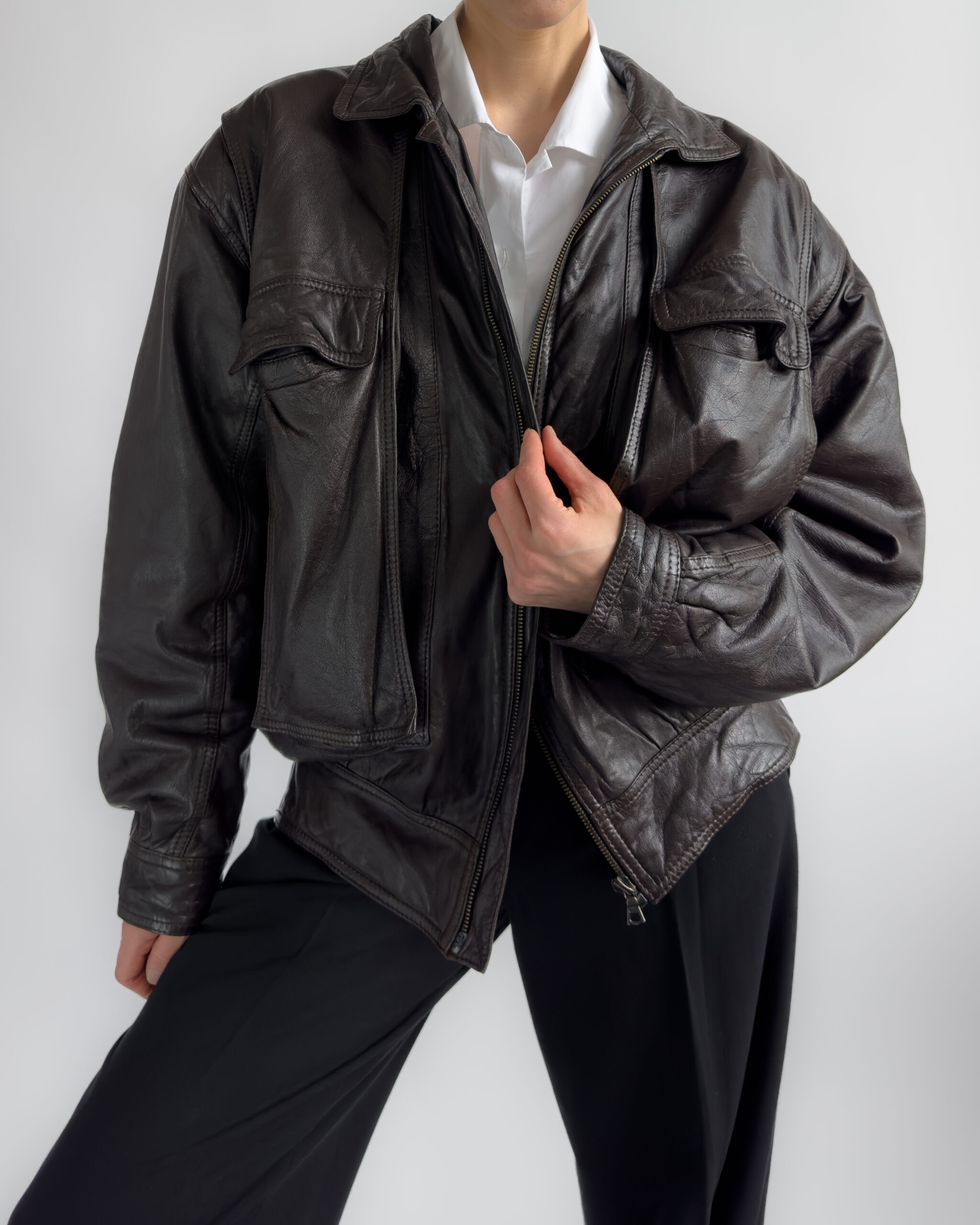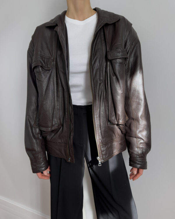 Made from lambs leather, this bomber jacket features a relaxed, cocoon-like silhouette with exaggerated volume. Designed with functional pockets and a zip-front closure