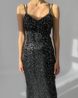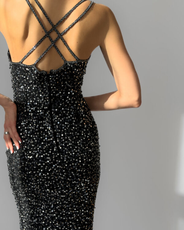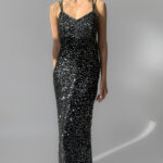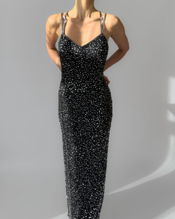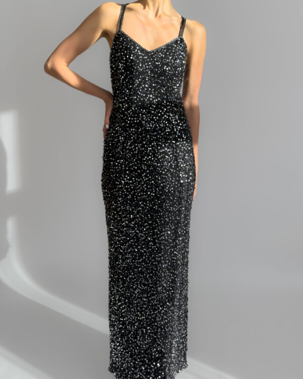 Elegant full-length gown featuring shimmering black and silver sequins throughout. Designed with a flattering double-strap neckline, back zipper closure, and a subtle back slit. The interior is fully lined in 100% pure silk, providing a luxurious feel against the skin.