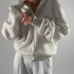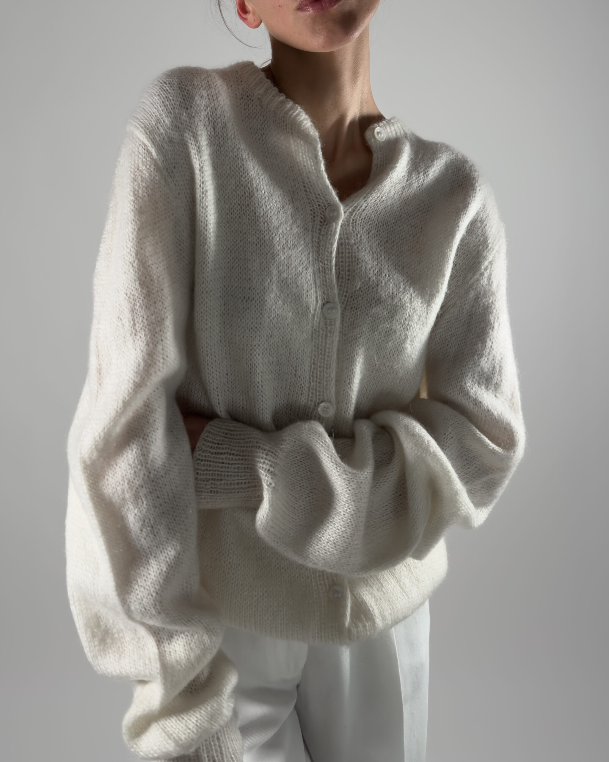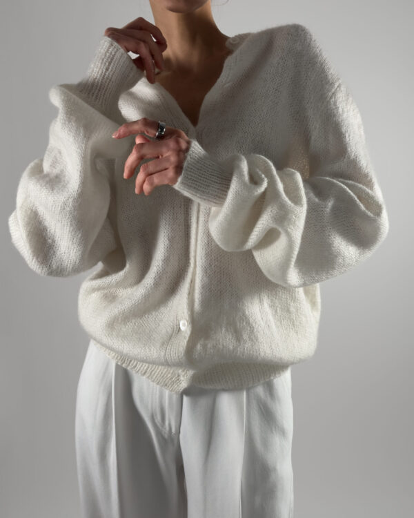 Beautiful handmade oversized mohair cardigan in white. Designed with a soft texture, button-up closure, and elegant balloon sleeves.