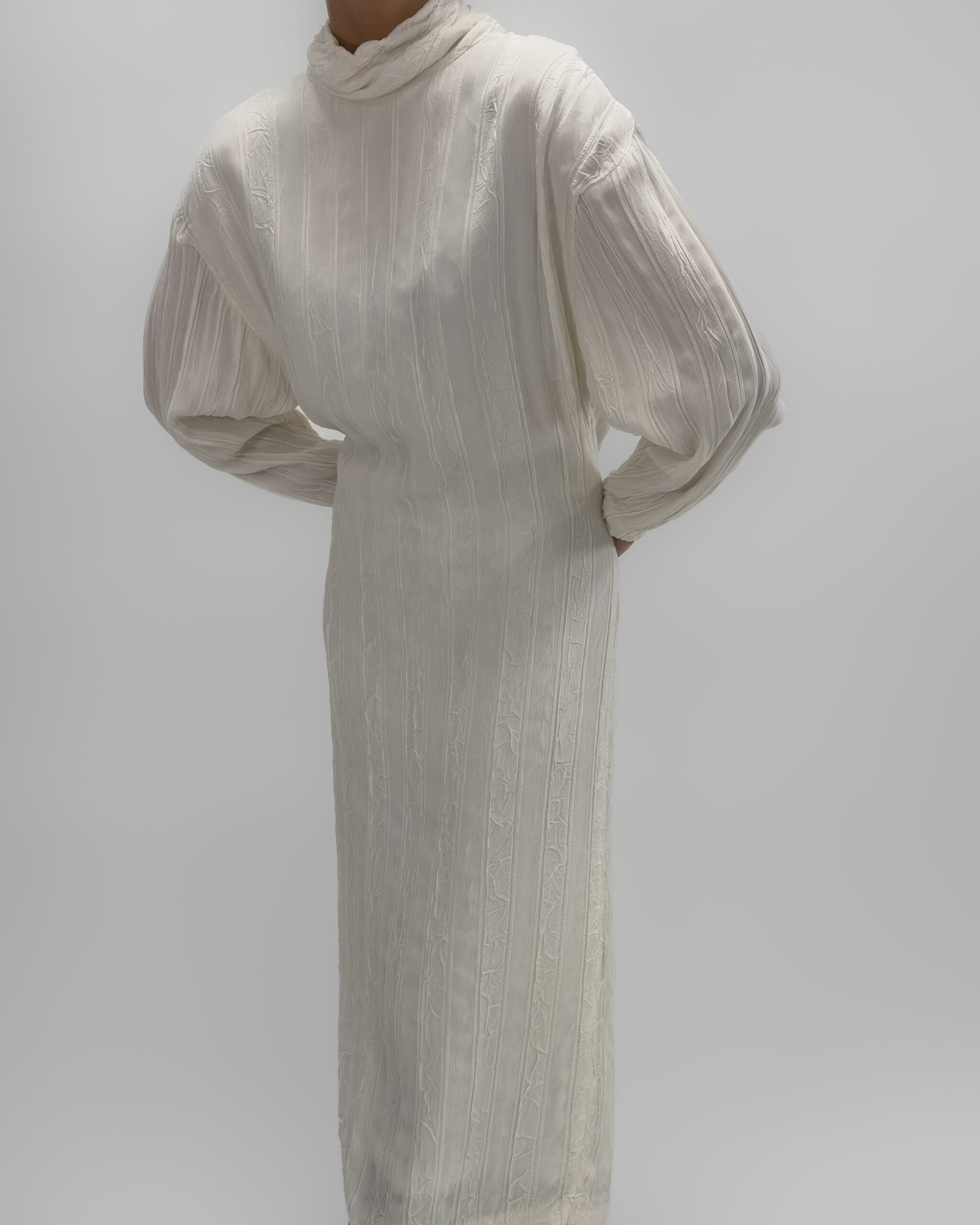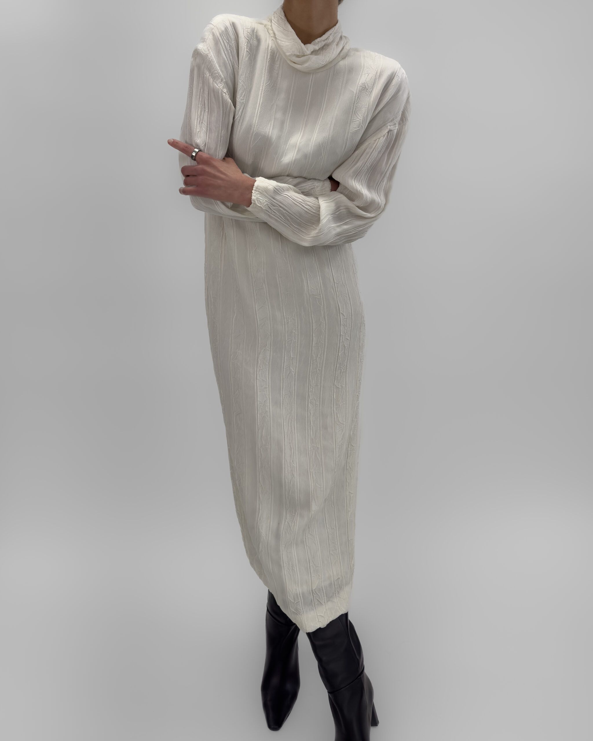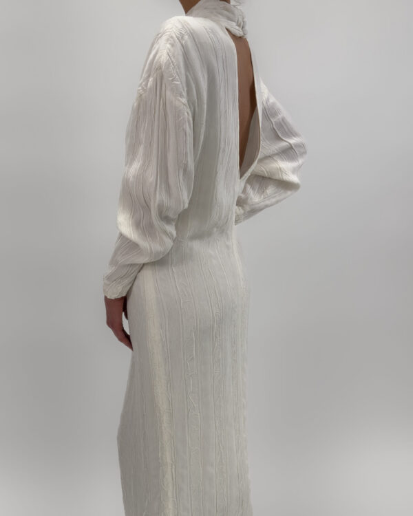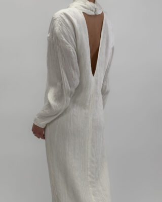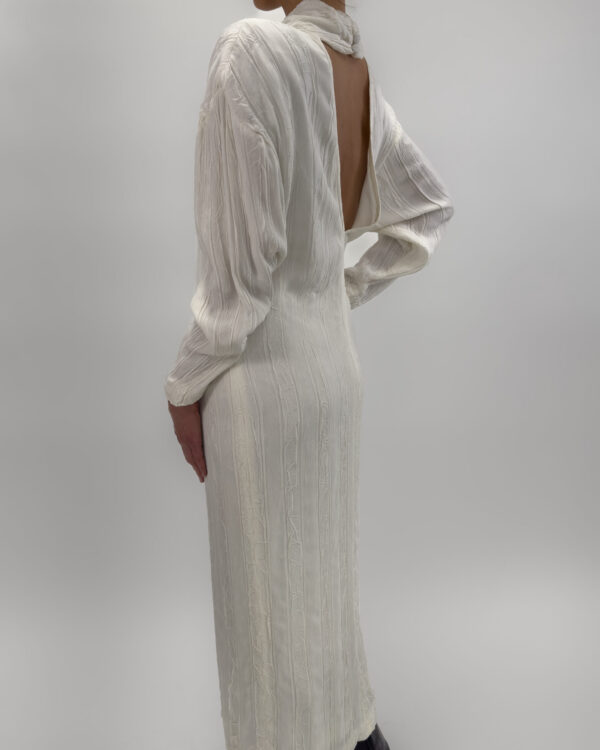 Absence of a material label, feels like blend of viscose and silk. Flattering silhouetted, lining and elegant open-back design.