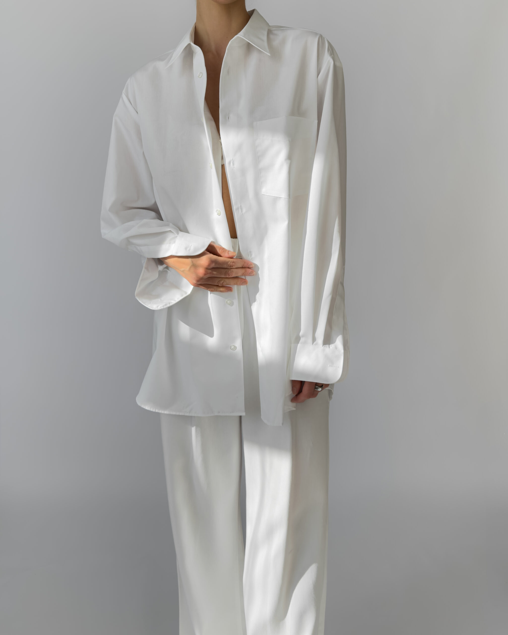 Crisp and timeless oversized white shirt by Walbusch, labelled Extra Glatt Bügelfrei (easy-care, wrinkle-free). Made from 100% cotton, offering a soft yet structured drape. Features a classic collar, single chest pocket, and button-down closure.