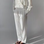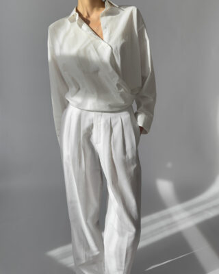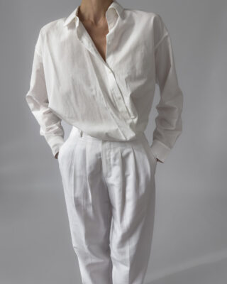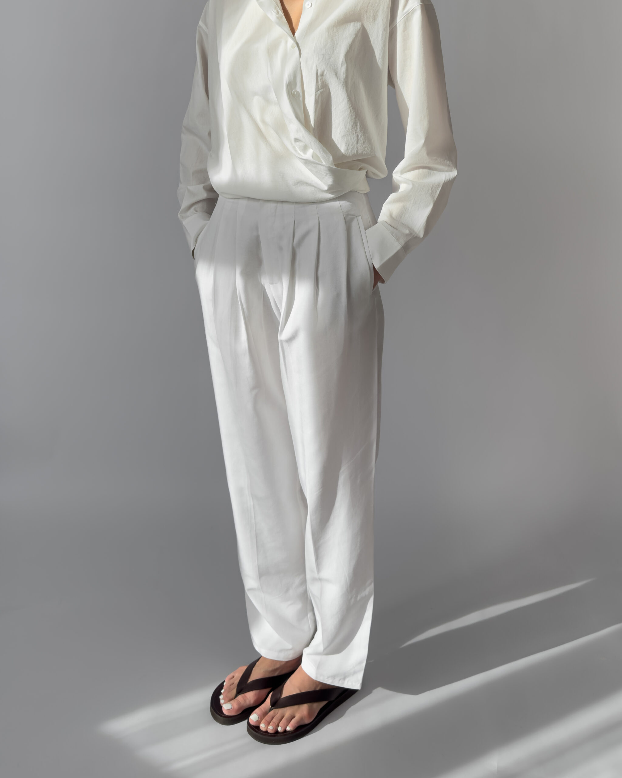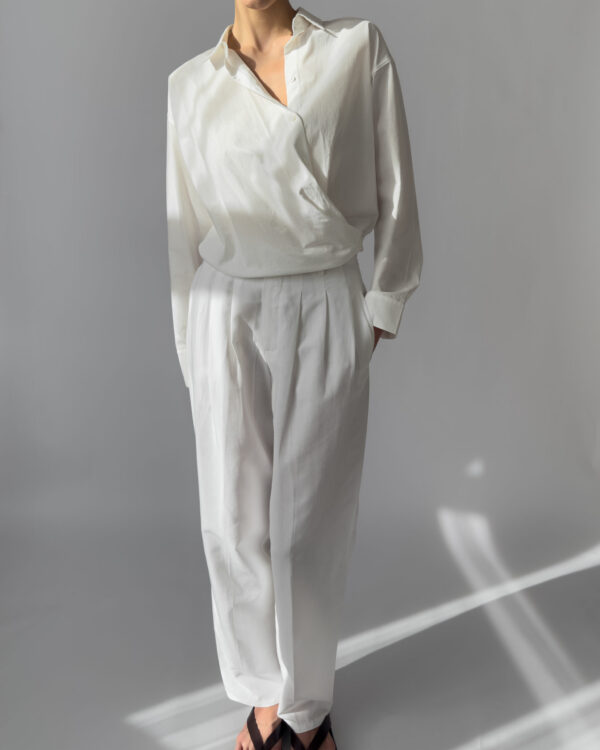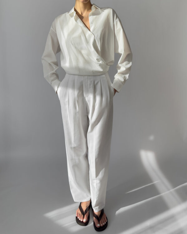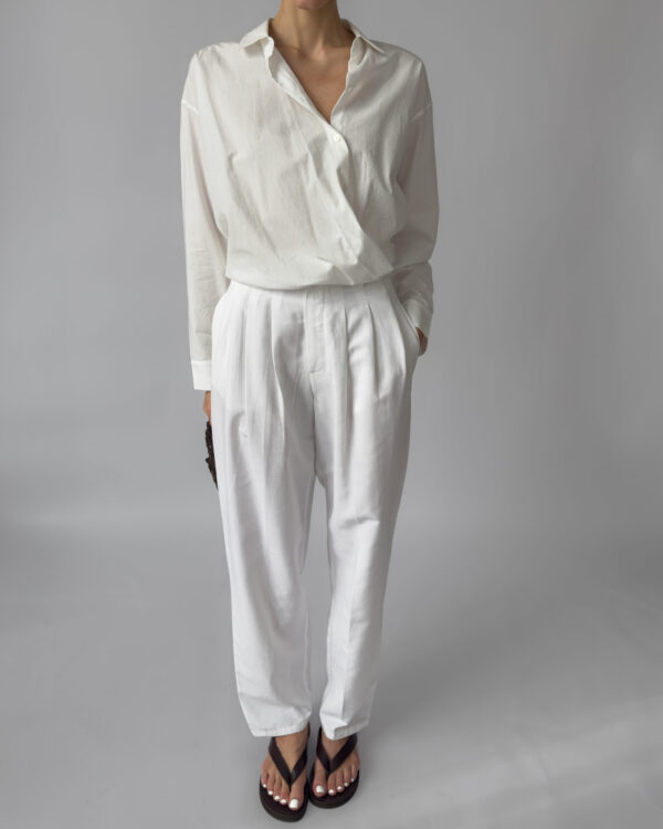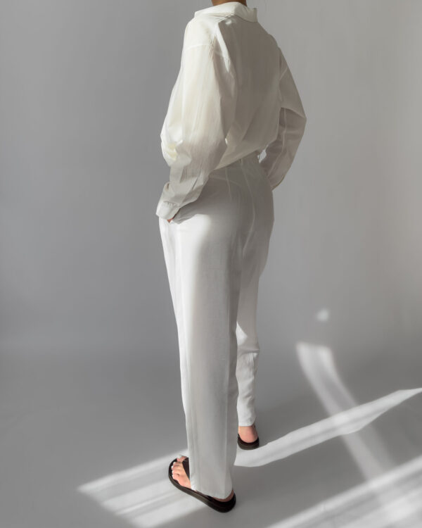 These white pleated trousers from Downtown feature a lightweight linen blend, high waist with belt loops, front zip closure, and side pockets. Perfect for minimalist styling.