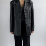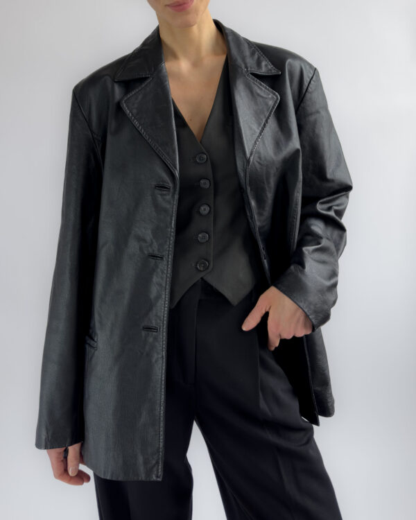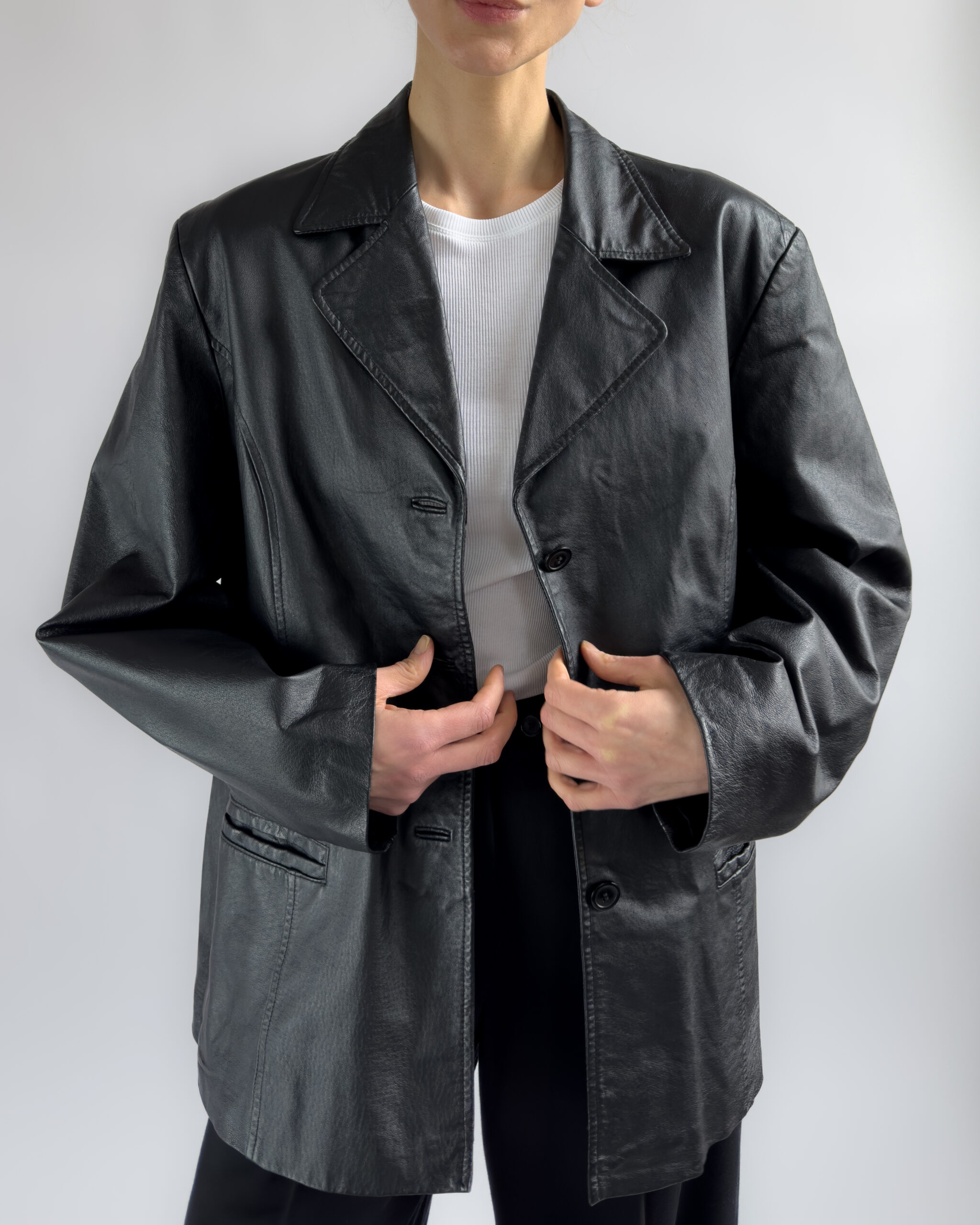 Made from genuine leather, this sleek black jacket features a sharp blazer-style silhouette with classic notched lapels and subtle structure.