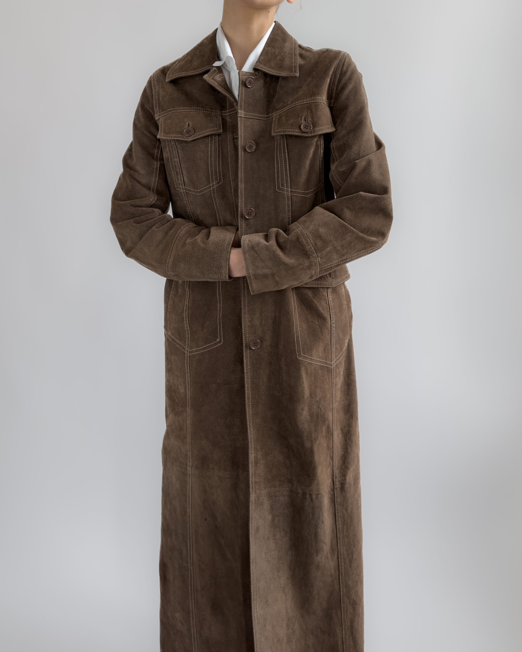 Longline suede coat with a structured silhouette. Made from soft genuine leather in a rich brown tone, it features a full button closure, front flap pockets, and tonal stitching throughout. The full-length cut adds understated drama.