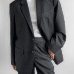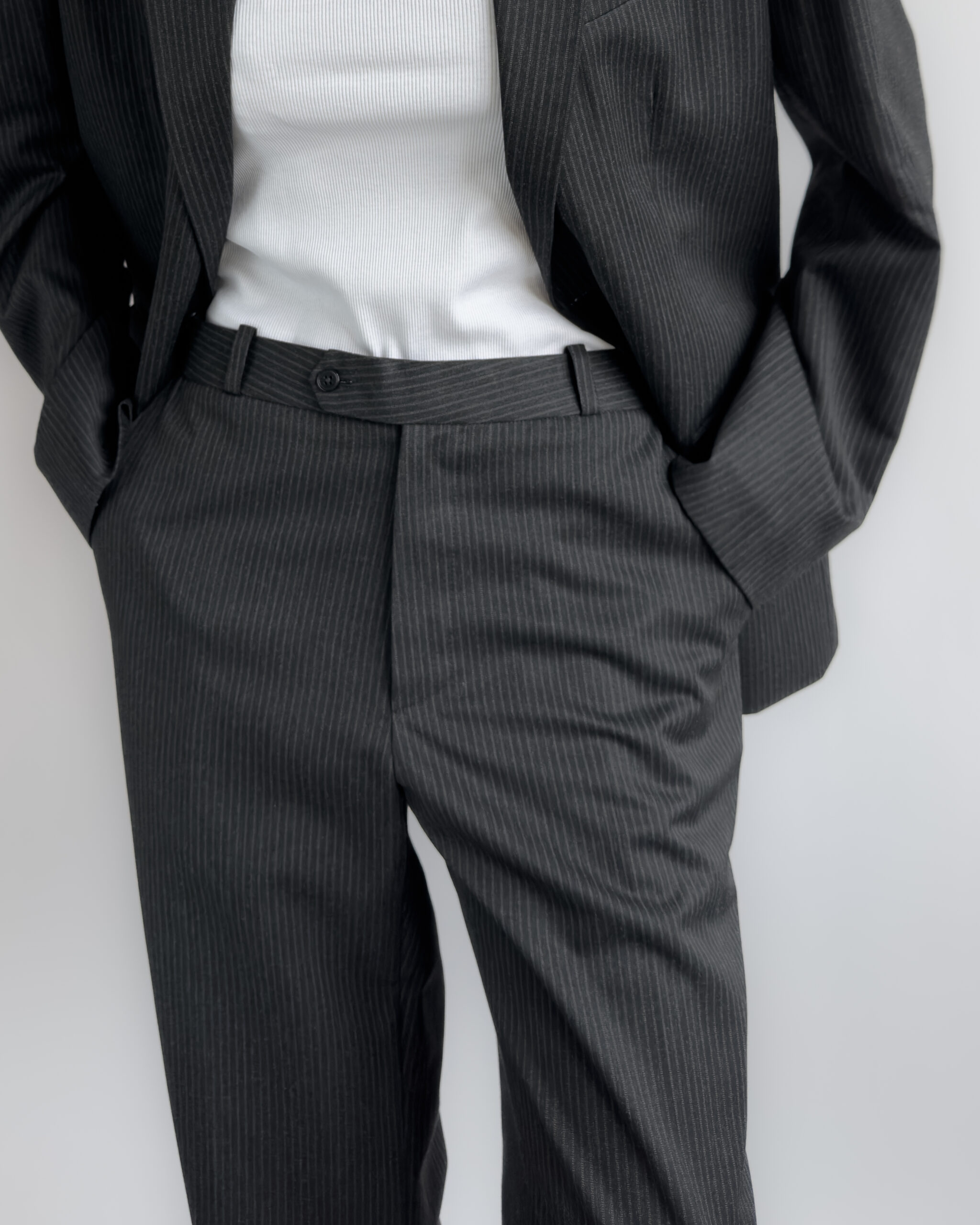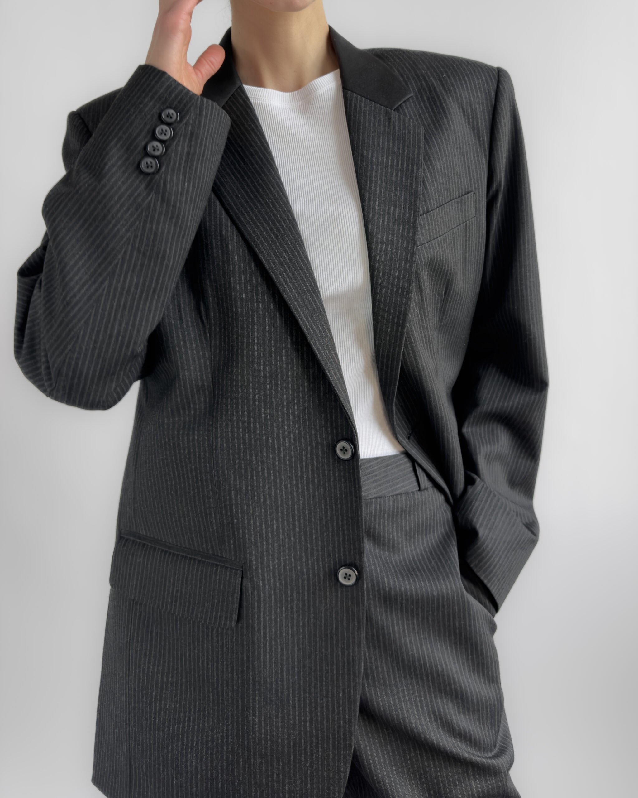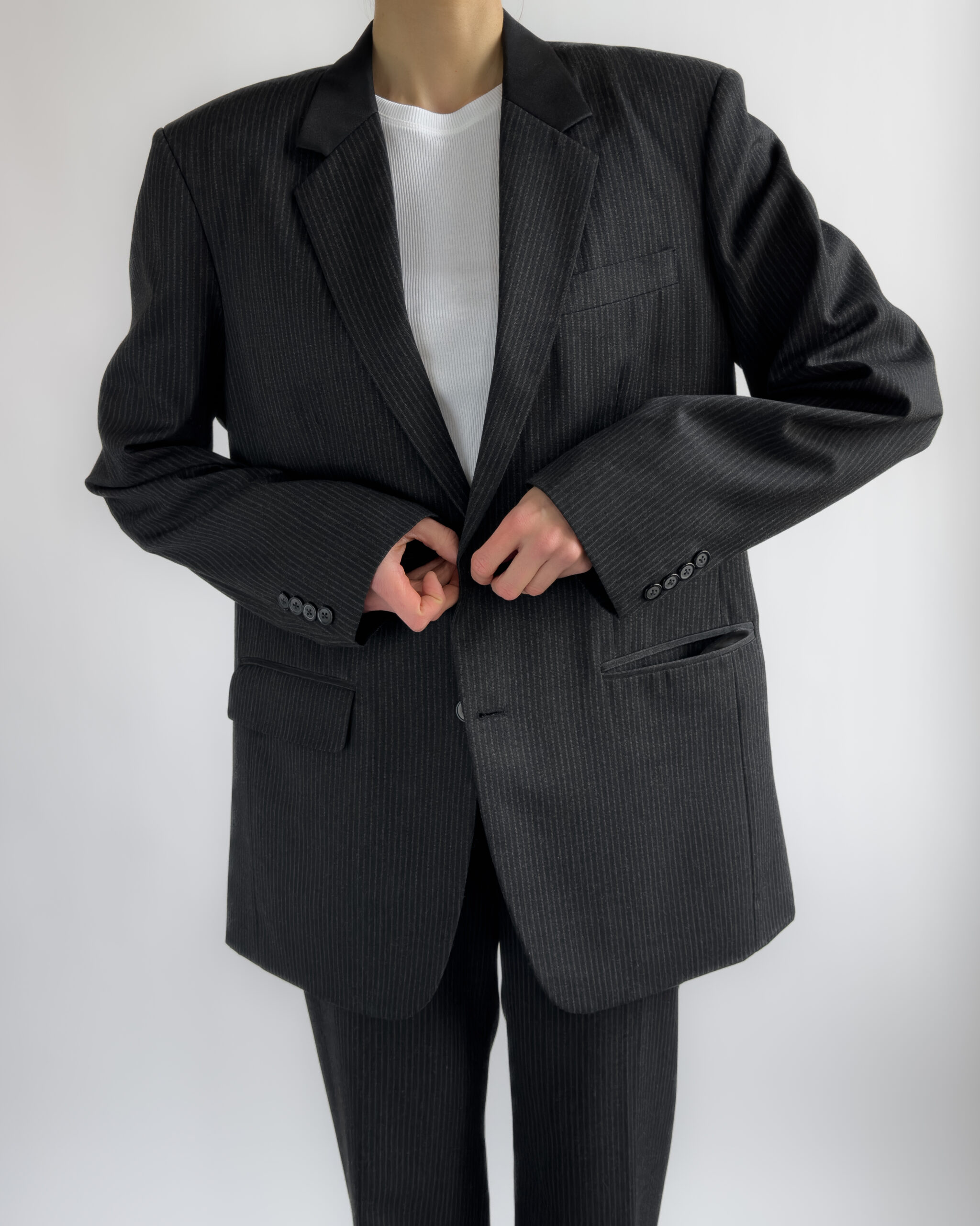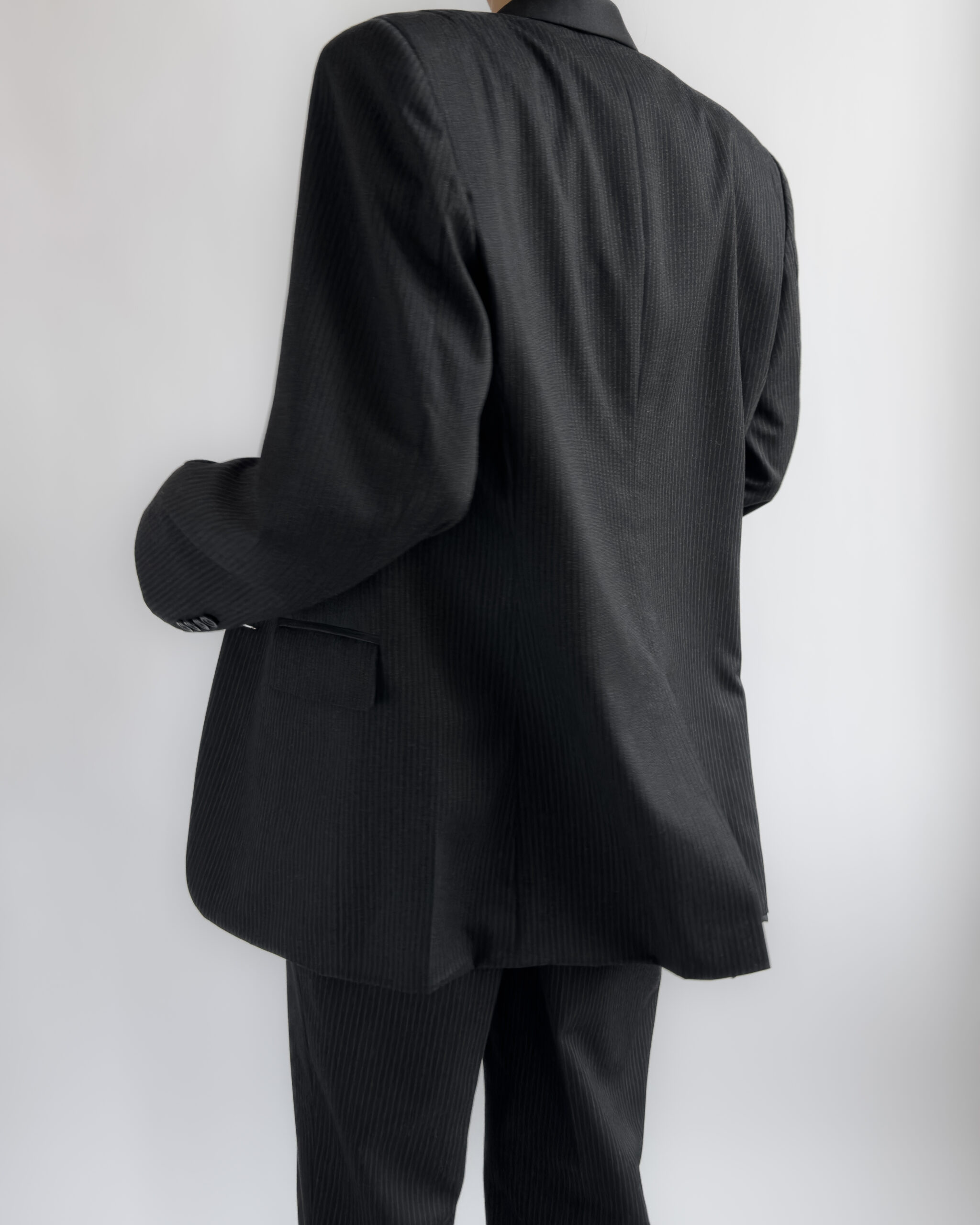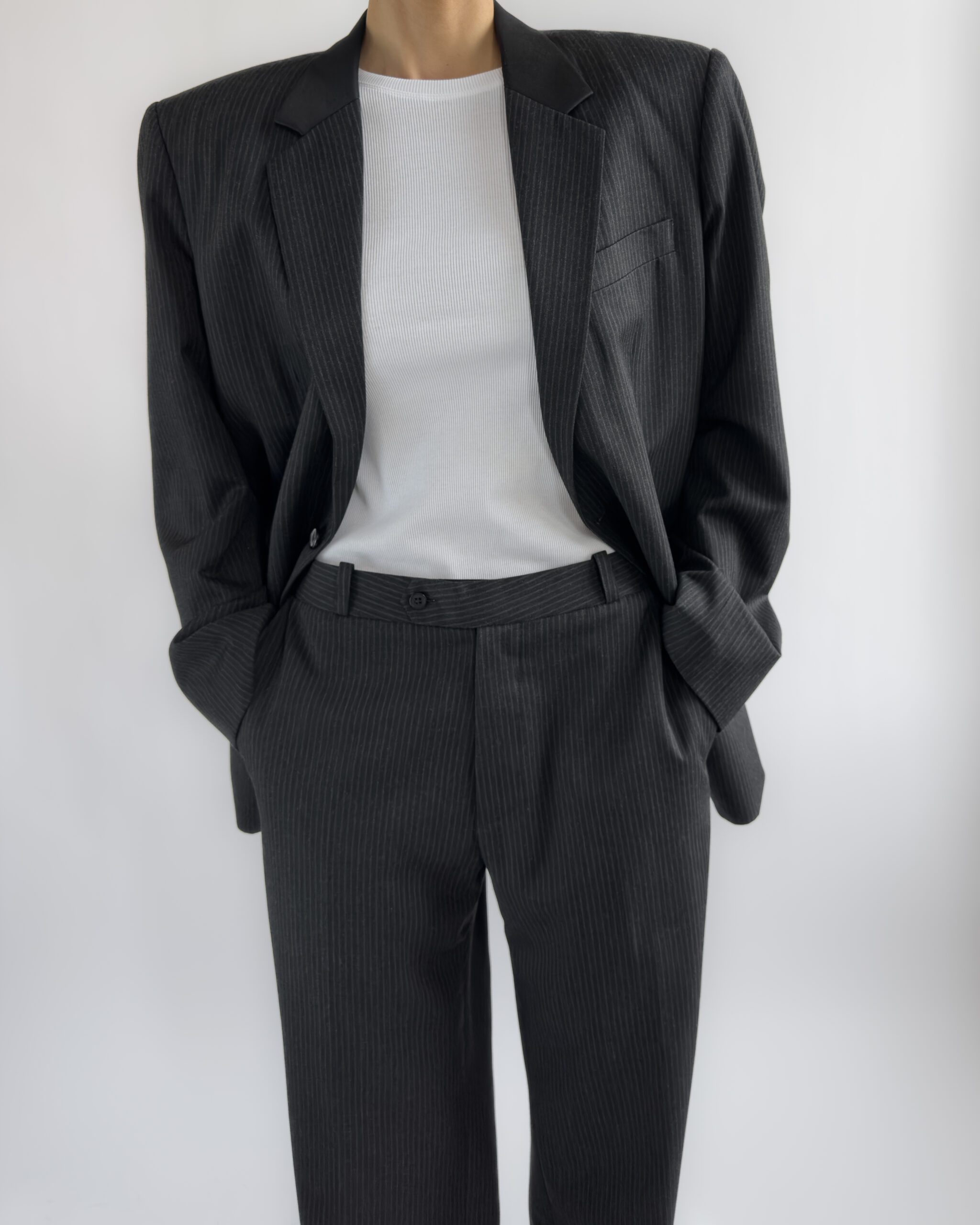 A timeless two-piece tailored suit in a charcoal pinstripe, made with sharp shoulders and a refined silhouette. The blazer features structured shoulder pads, notched lapels, while the matching trousers offer a classic straight-leg fit. Though unlabelled, the material feels like a premium wool blend, fully lined in a smooth viscose.