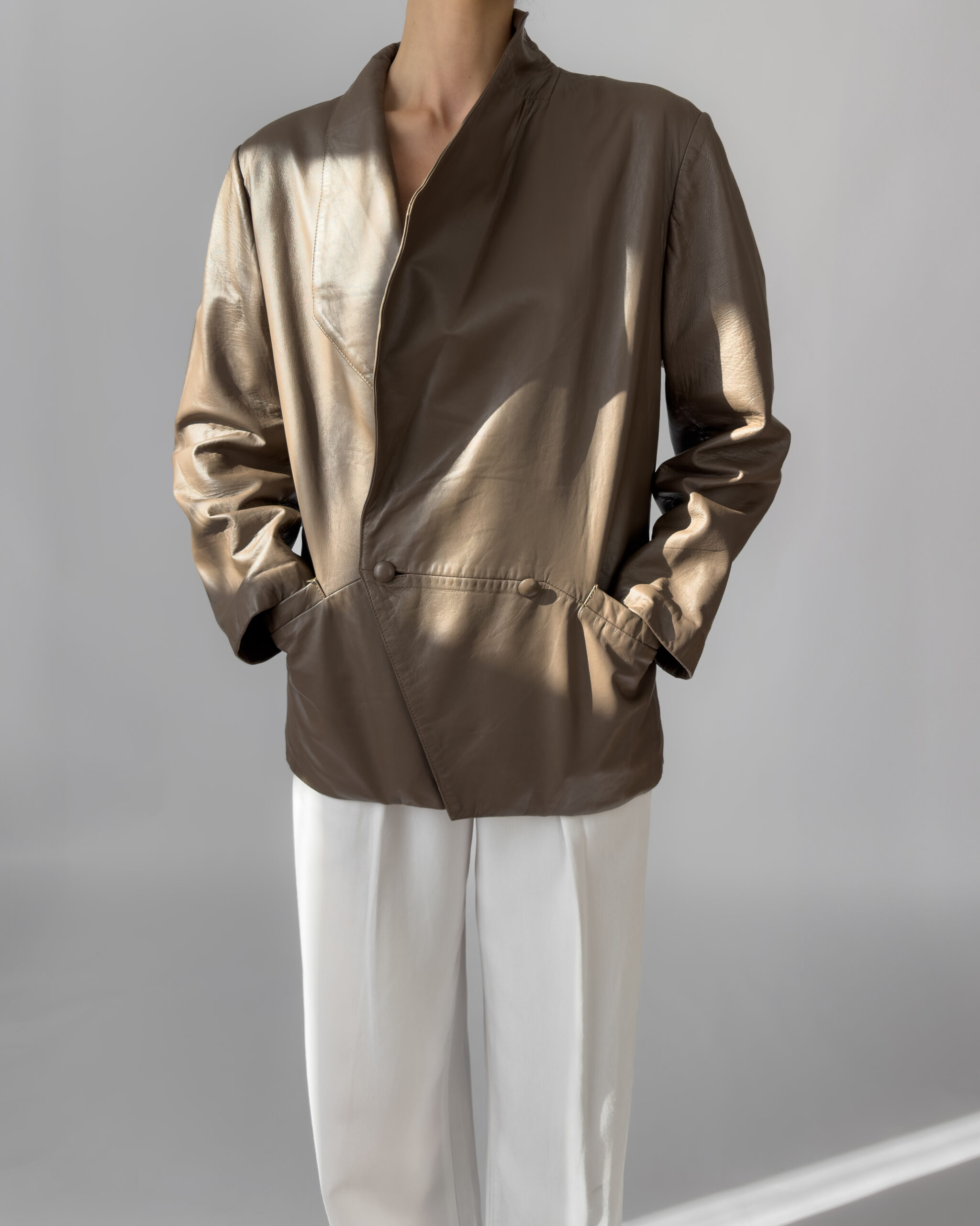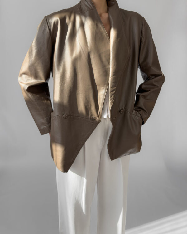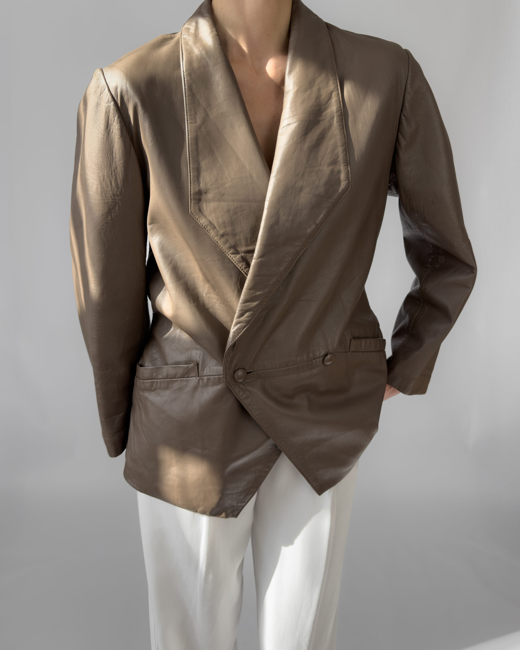 Soft taupe leather, this jacket from Pietro Donatello has distinctive asymmetrical double‑button closure and subtle back tailoring—elegant yet relaxed. Made in France from 100% leather.