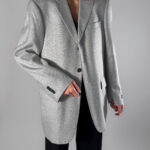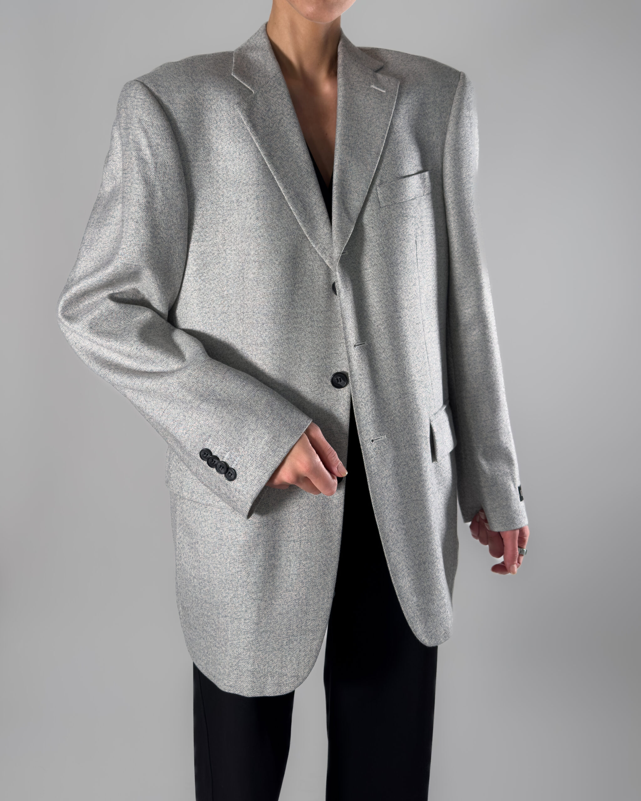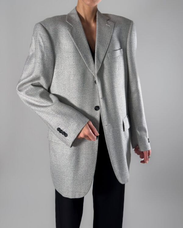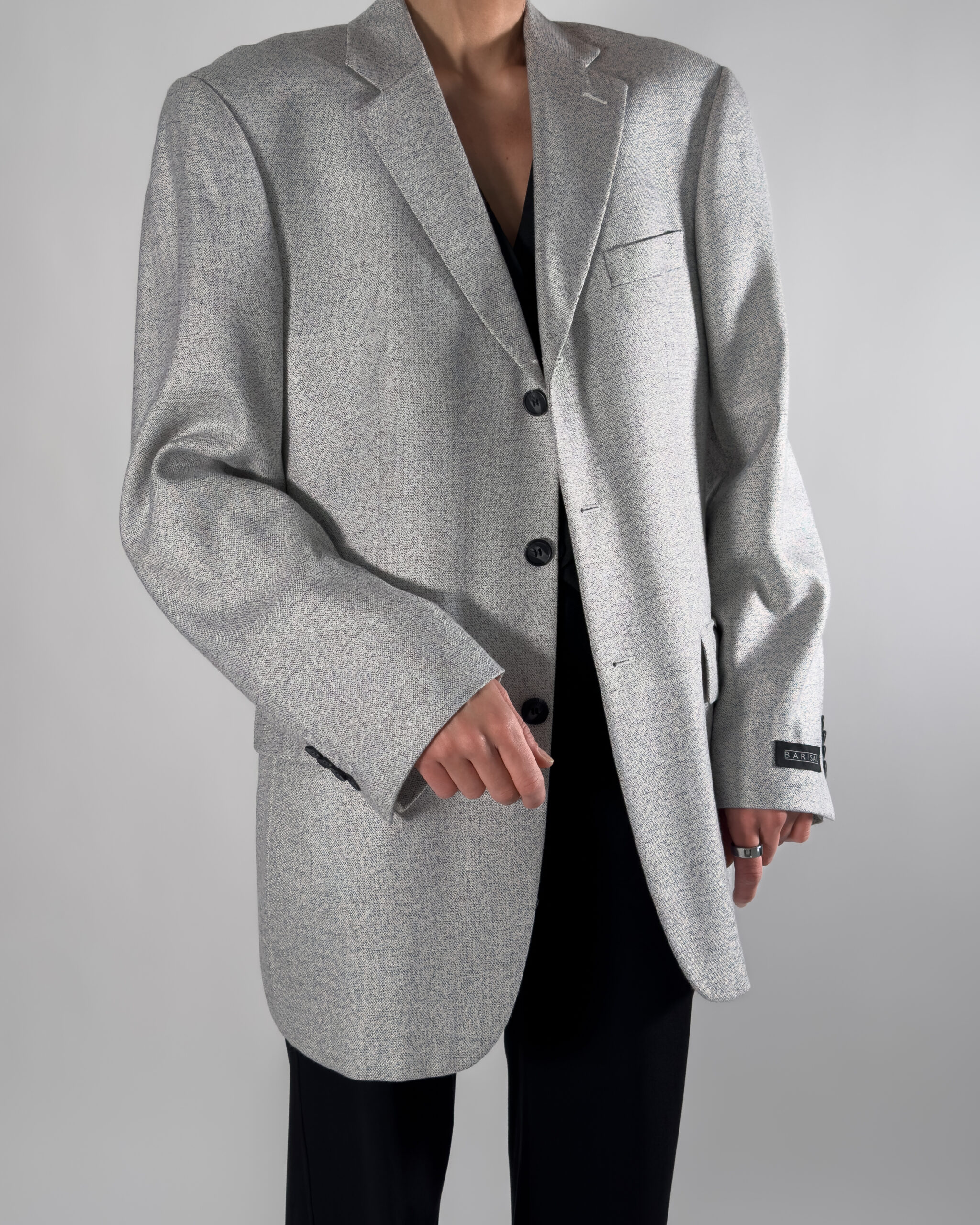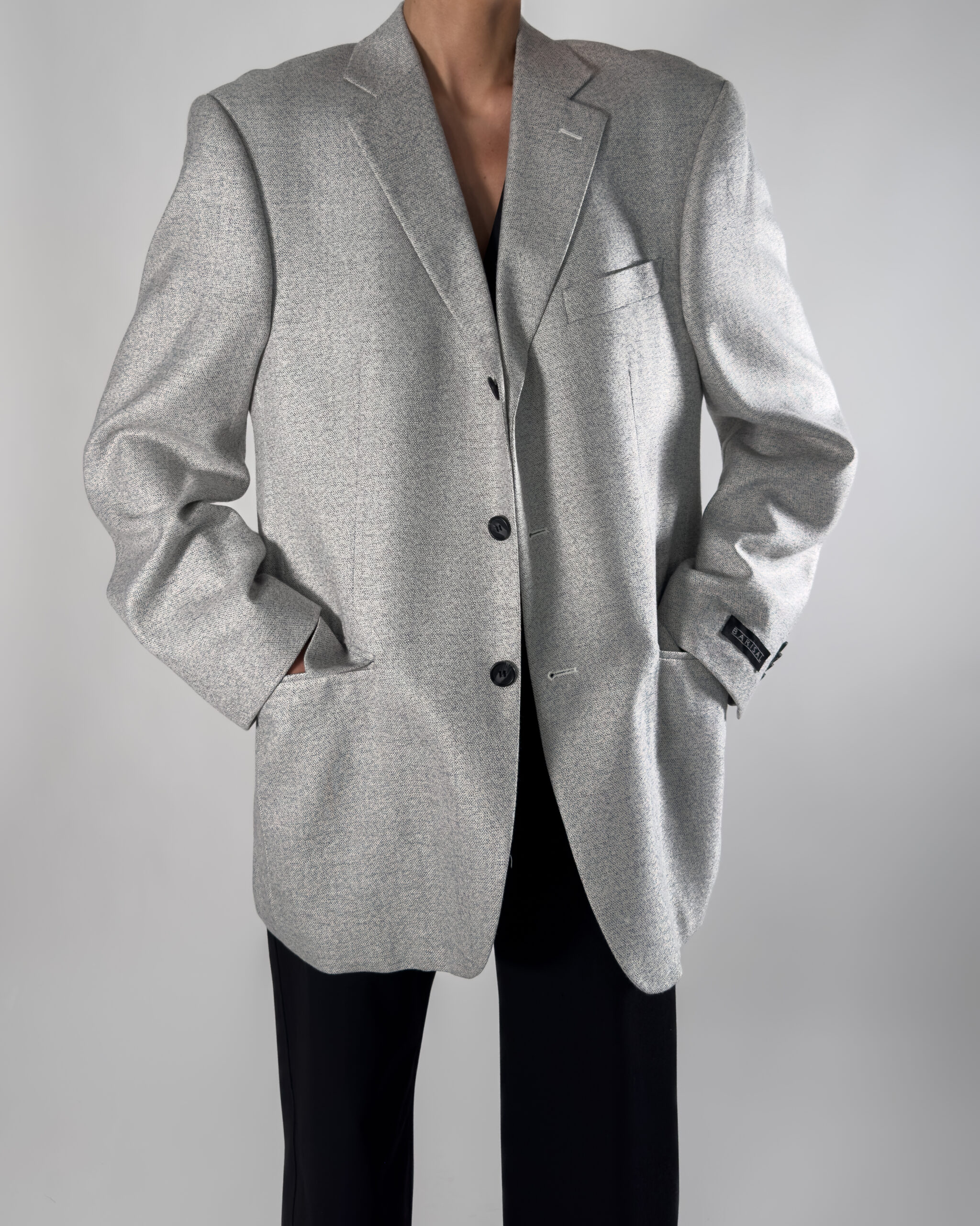 Unisex/mens wool blend blazer in a soft light grey hue. By Barisal, this blazer features a button-up closure and a classic back slit.