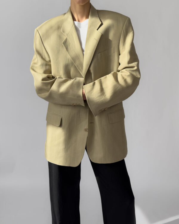 Sophisticated light olive pinstriped blazer by Yves Saint Laurent. Features button-up closures, two front pockets, structured shoulder pads, and a luxurious silky gold YSL monogram lining. A timeless piece.
